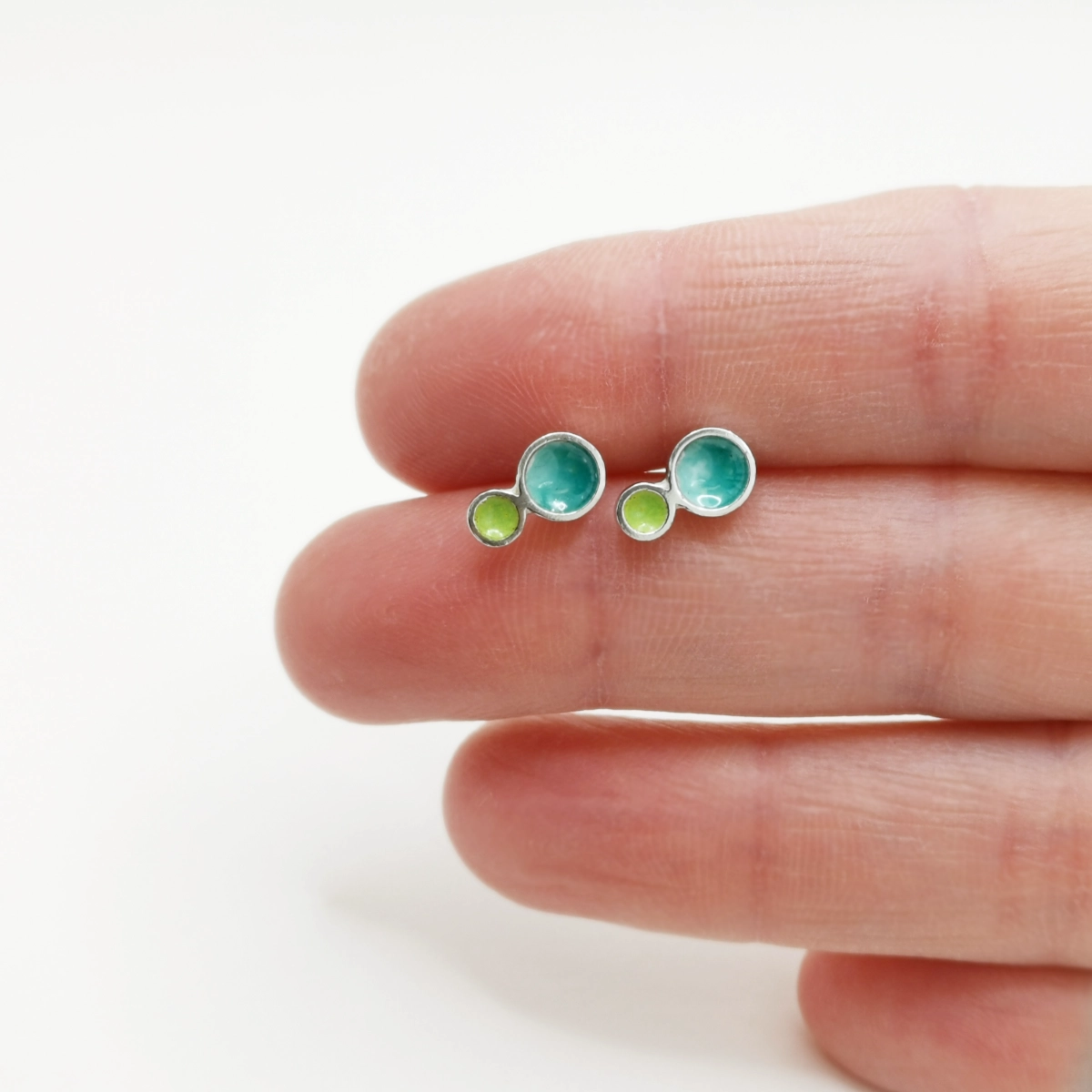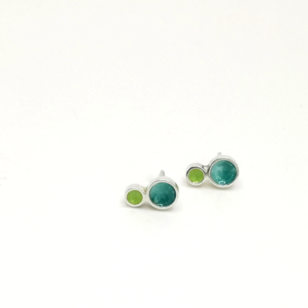 Pendientes de plata esmaltados en tonos azules y verdes con diseño circular.
