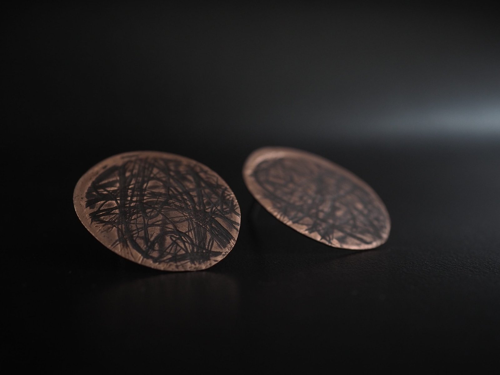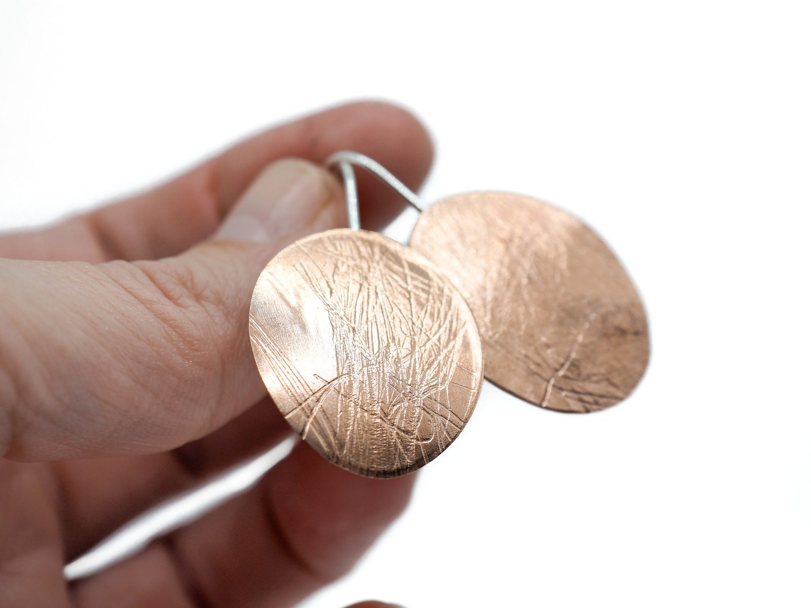 Elegantes pendientes de cobre y plata grabados con una orgánica textura que les confiere un toque distinto.