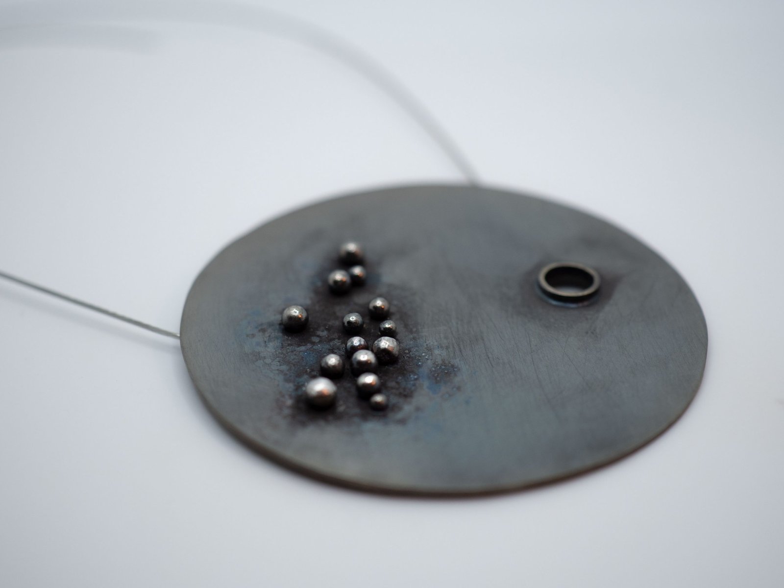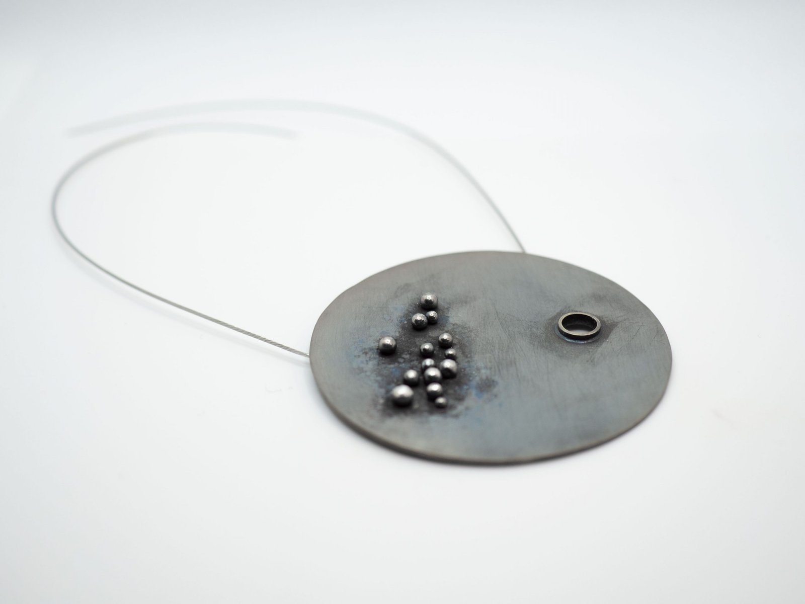 Colgante hecho en plata de ley y latón que inicialmente creé para un trabajo conceptual, simbolizando la abundancia y la carencia, una vez creado inevitablemente vi de nuevo esa simbología cósmica que tanto me atrae, los puntos de plata con estrellas orbitando en un espacio.