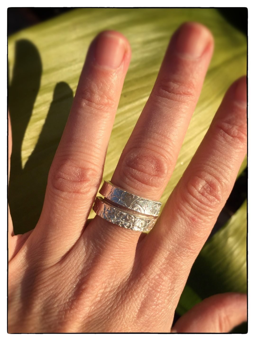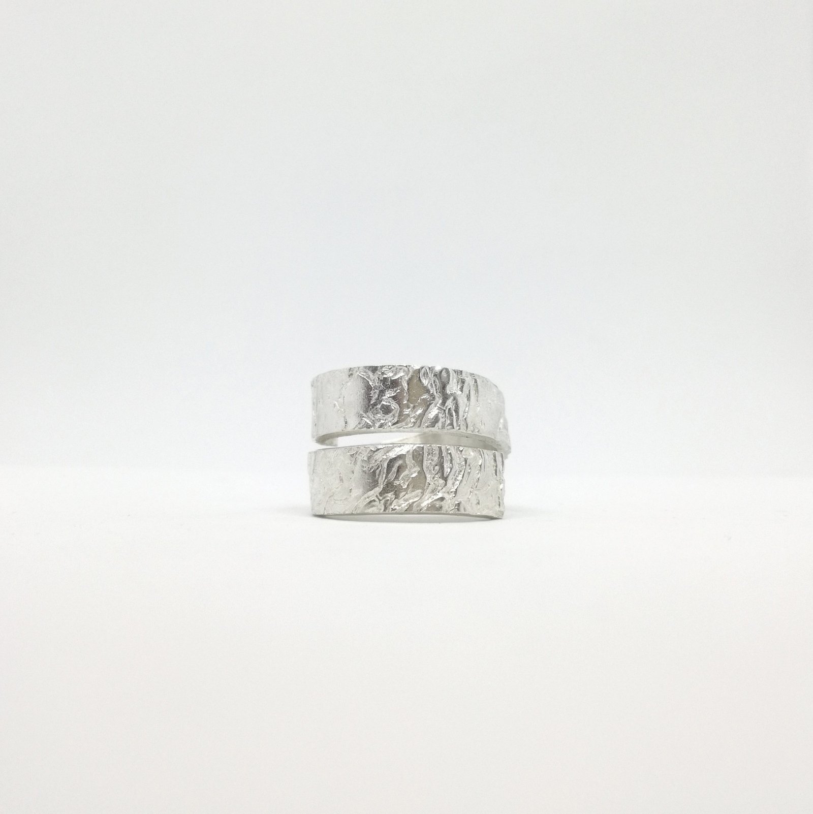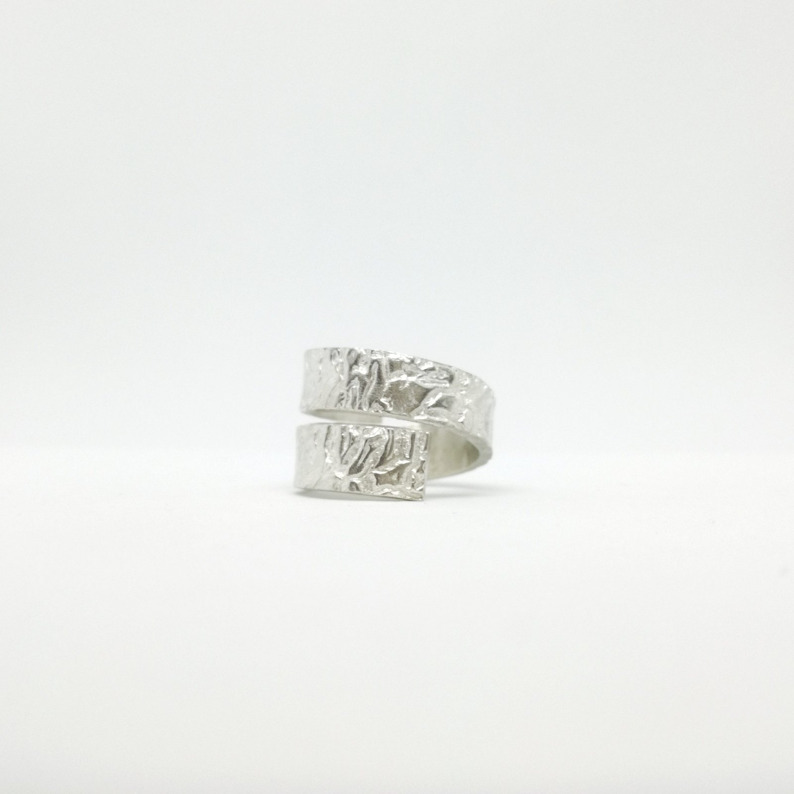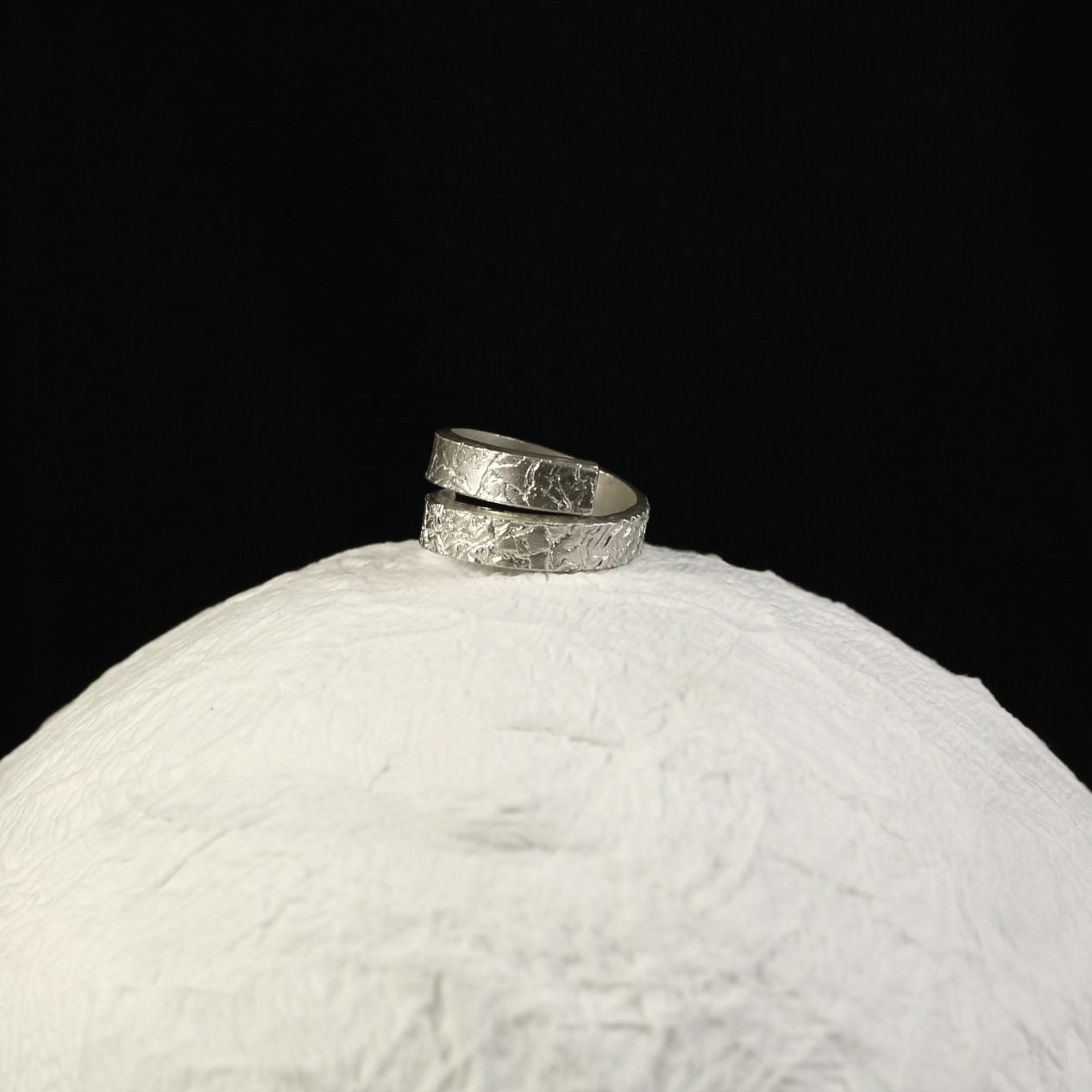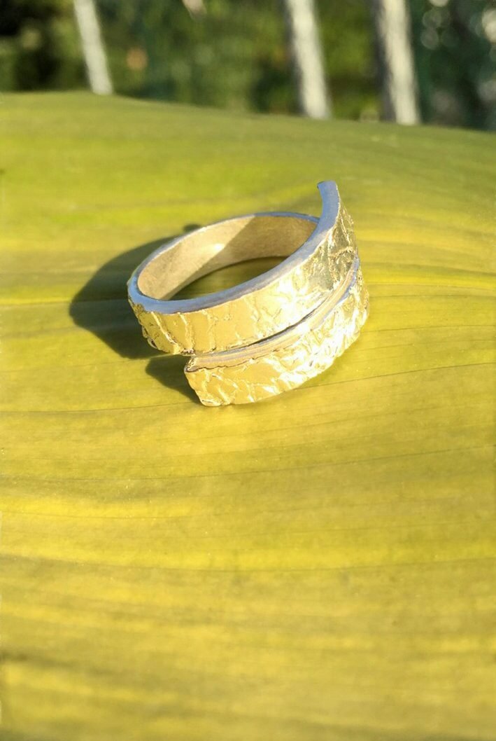 Anillo en espiral con texturas inspiradas en la naturaleza, moderno y elegante.