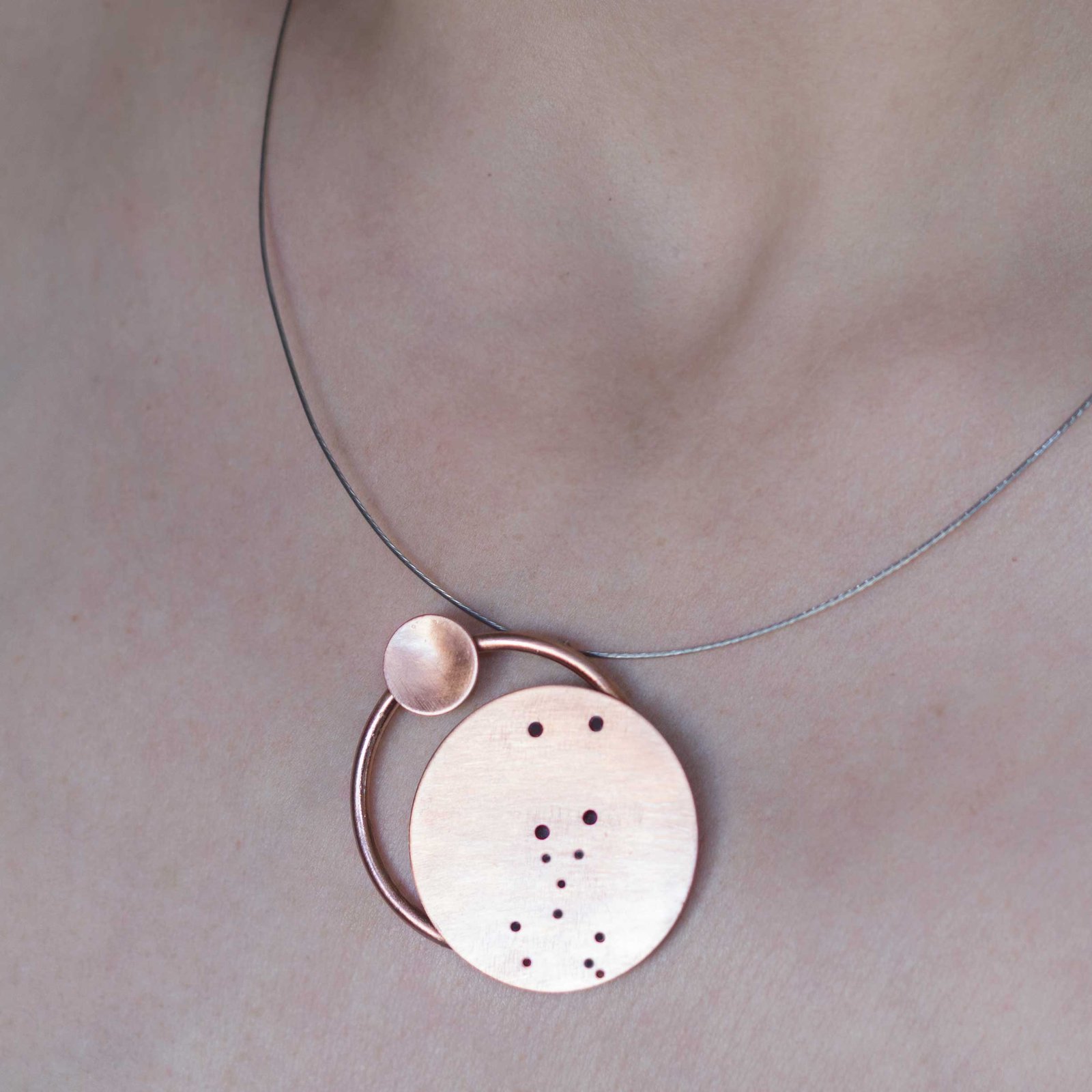 Elegante colgante de cobre con la constelación de Tauro como si estuviera orbitando, si te apasiona el cielo y sus magníficos secretos este colgante es para ti, si te apetece otra constelación, escríbeme e intentaré crear un nuevo diseño.