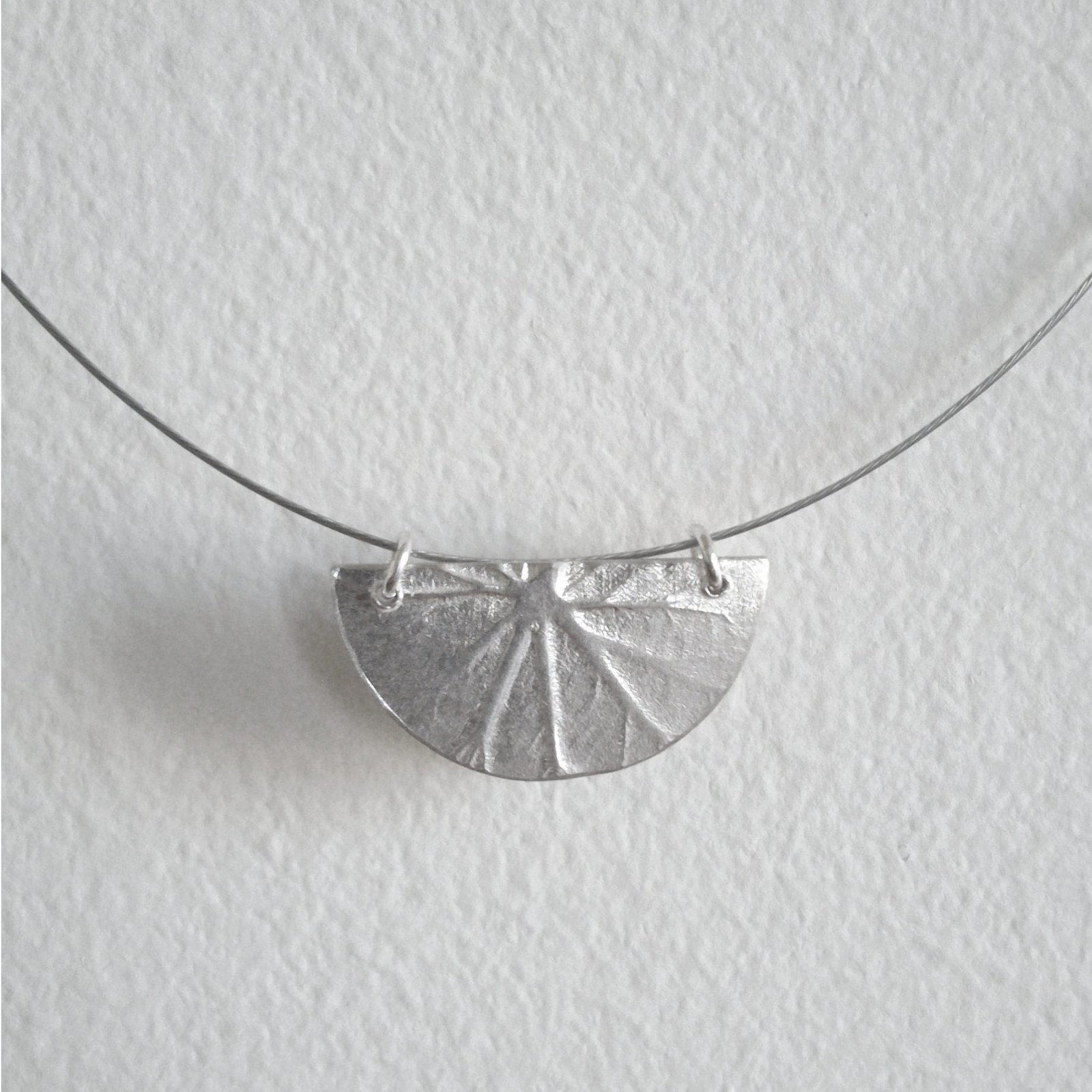 Colgante elaborado en plata de ley en forma de semicírculo y con textura de hoja.