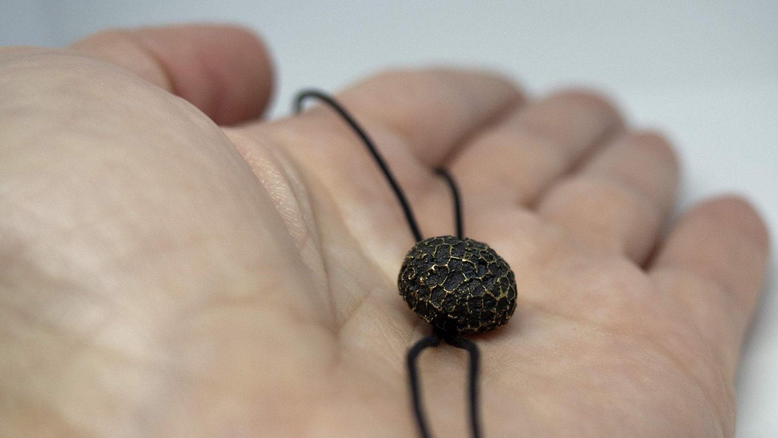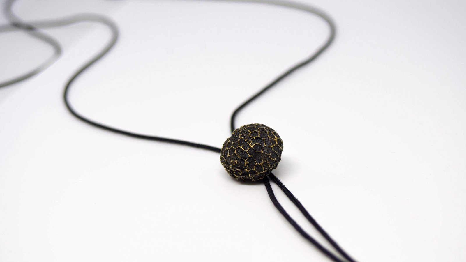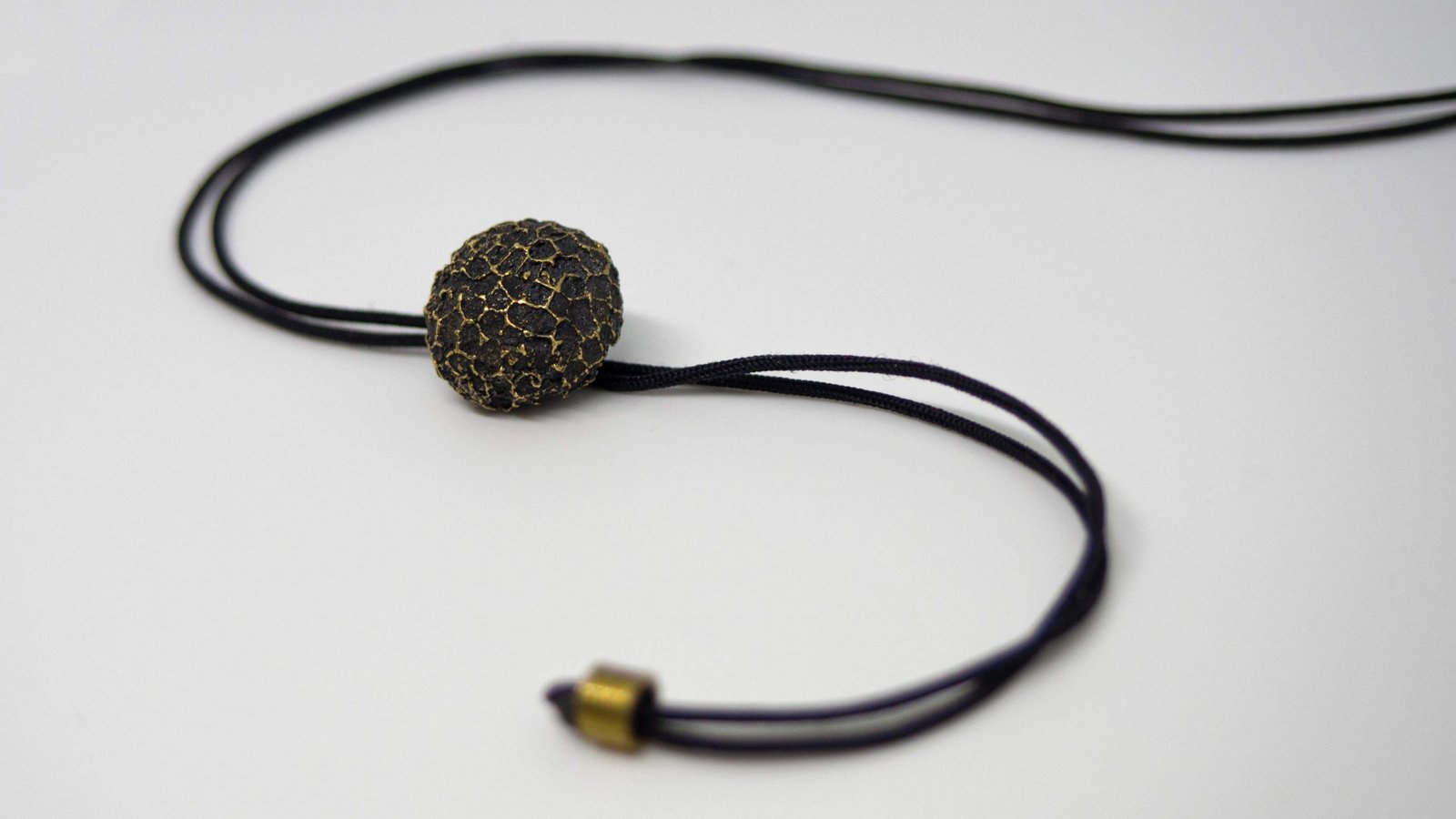 Colgante elaborado en latón con forma de semilla y con pátina negra que destaca su textura, montado con hilo de algodón negro.