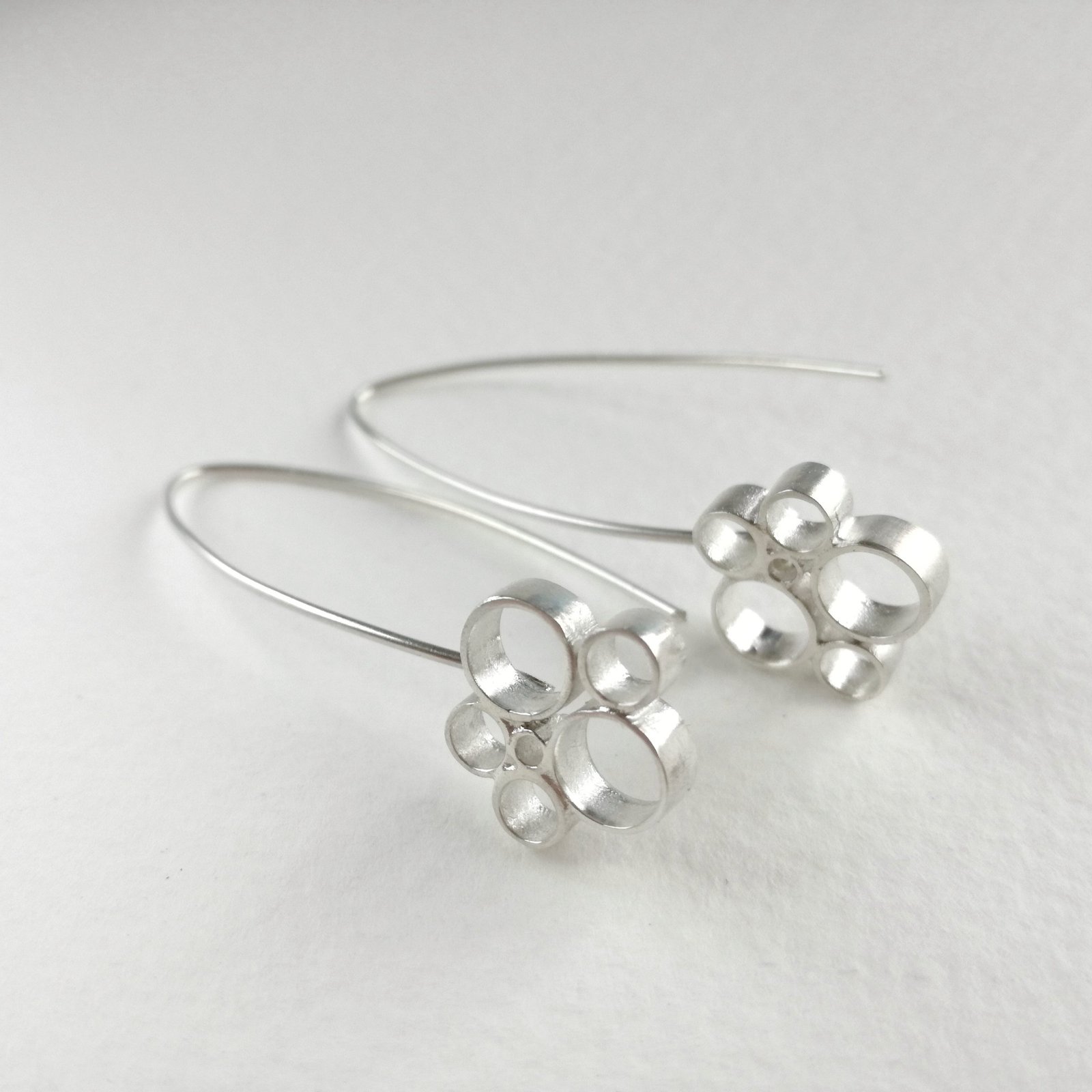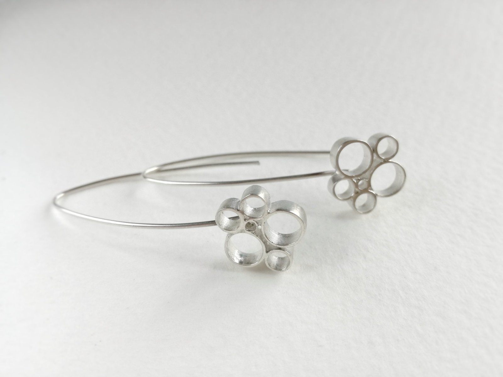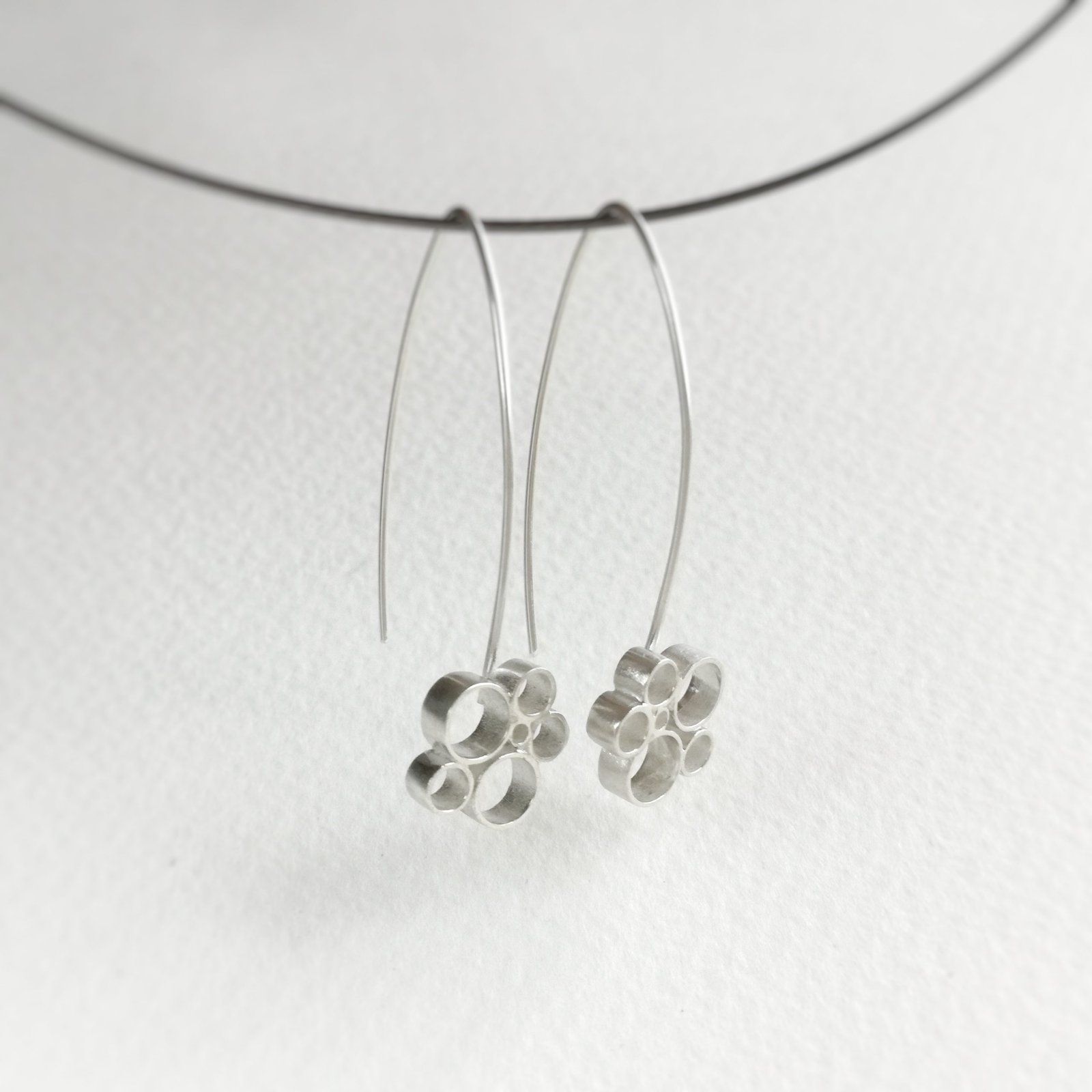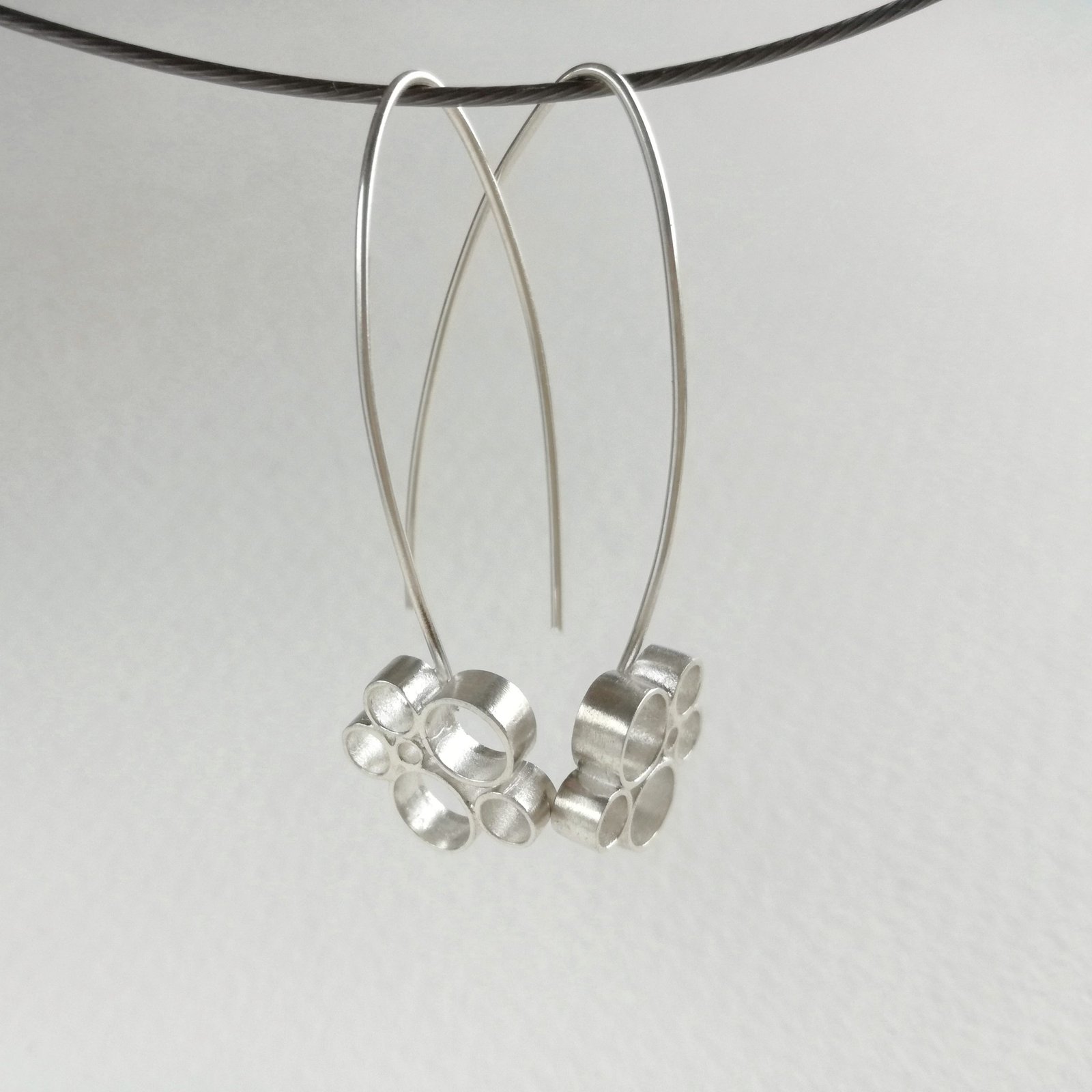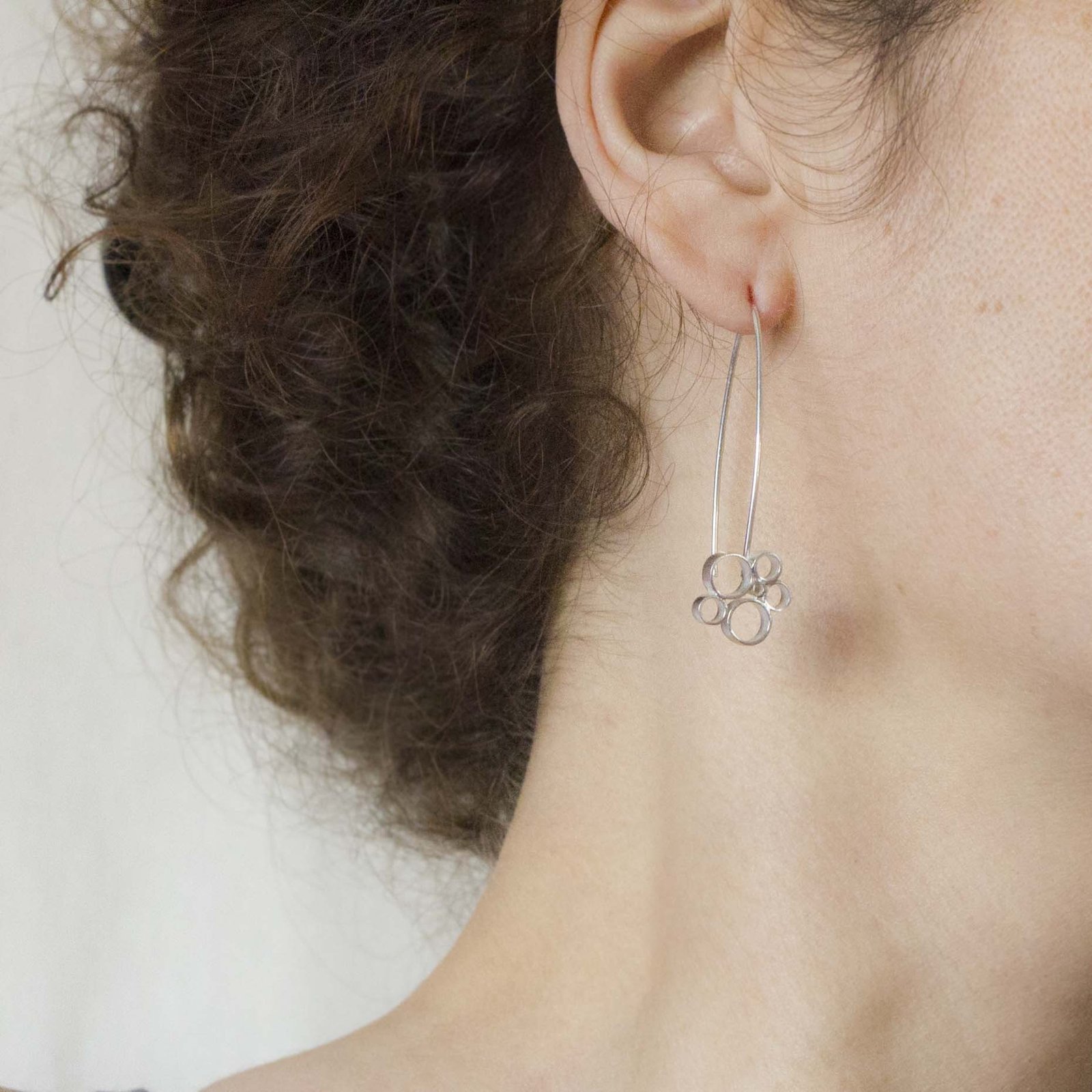 Pendientes elaborados en plata de ley con un diseño original en círculos,largos y elegantes.