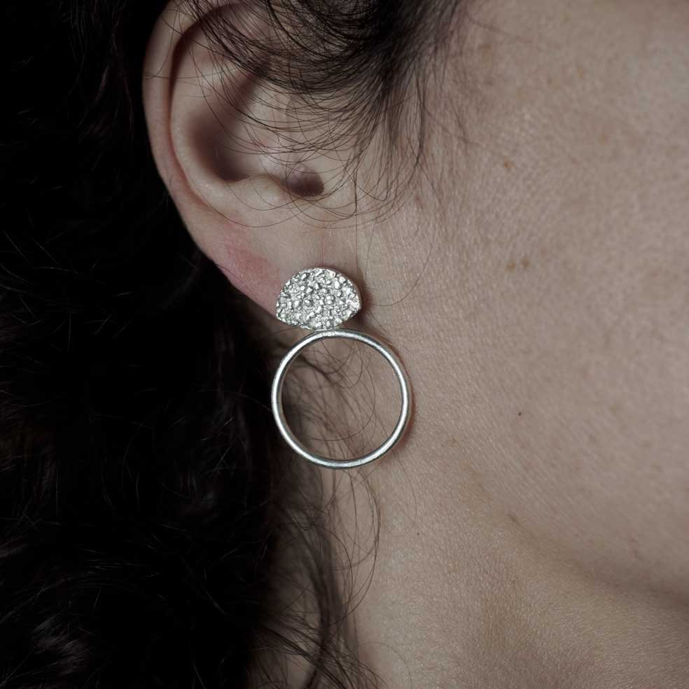 Pendientes de plata de ley con estructura geométrica y combinando el vacío y elegancia de un círculo de plata con una pequeña forma geométrica texturizada.