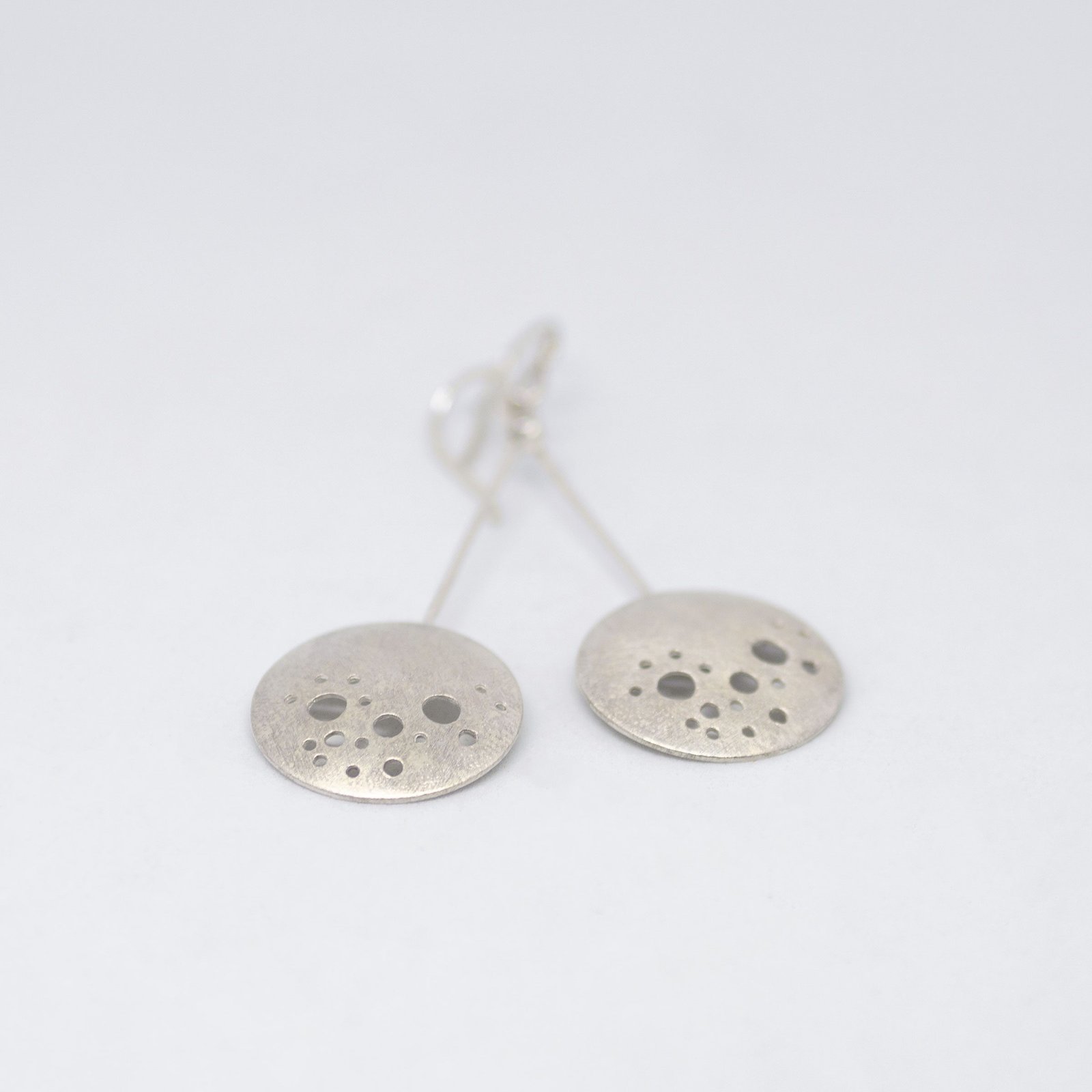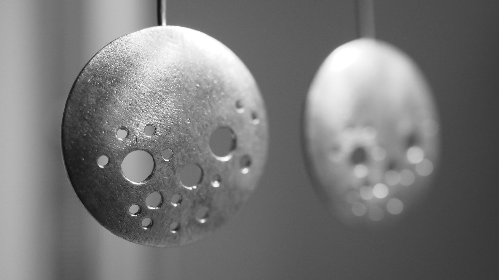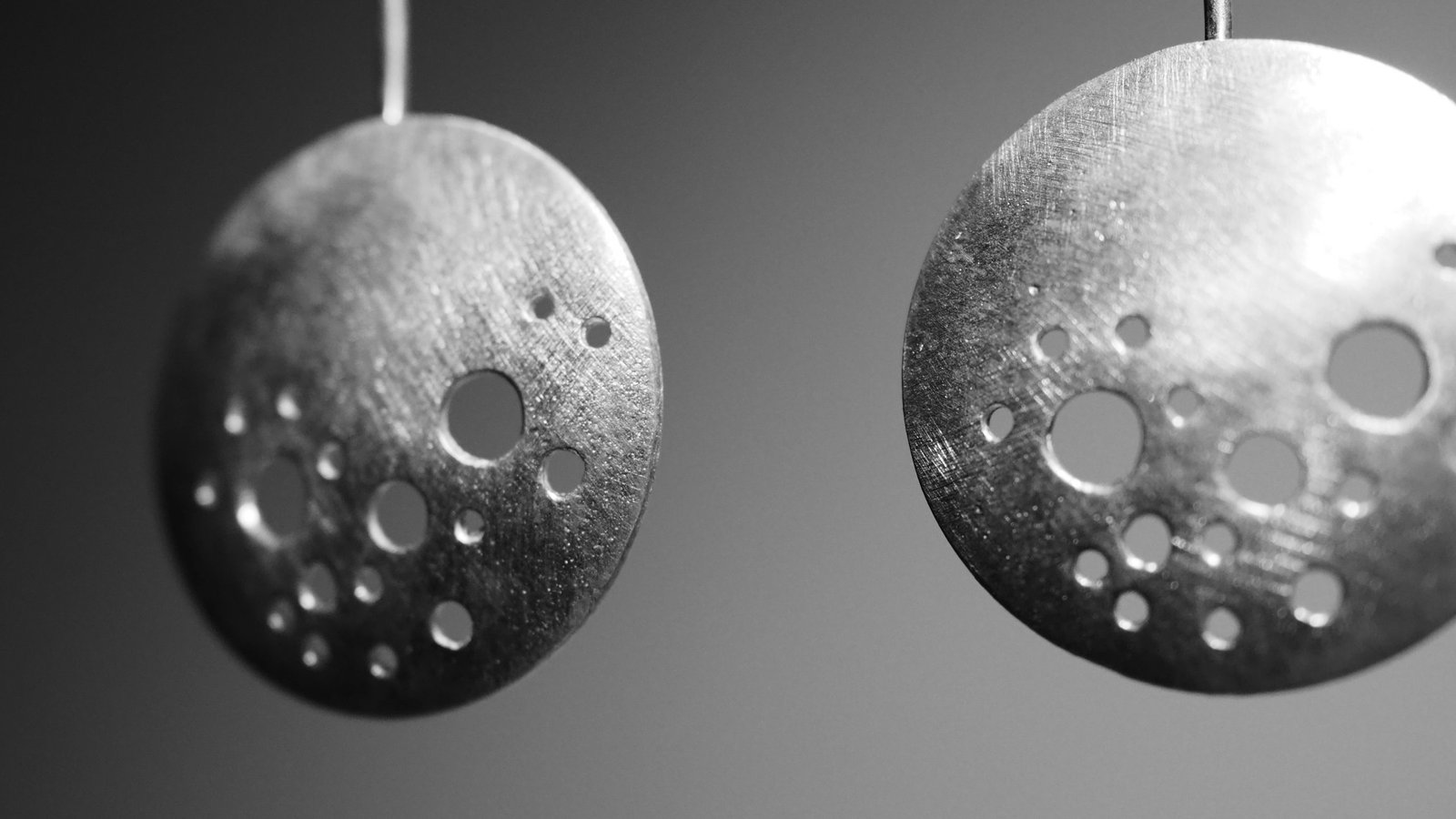 Pendientes creados en plata de ley con un diseño único circular y geométrico.