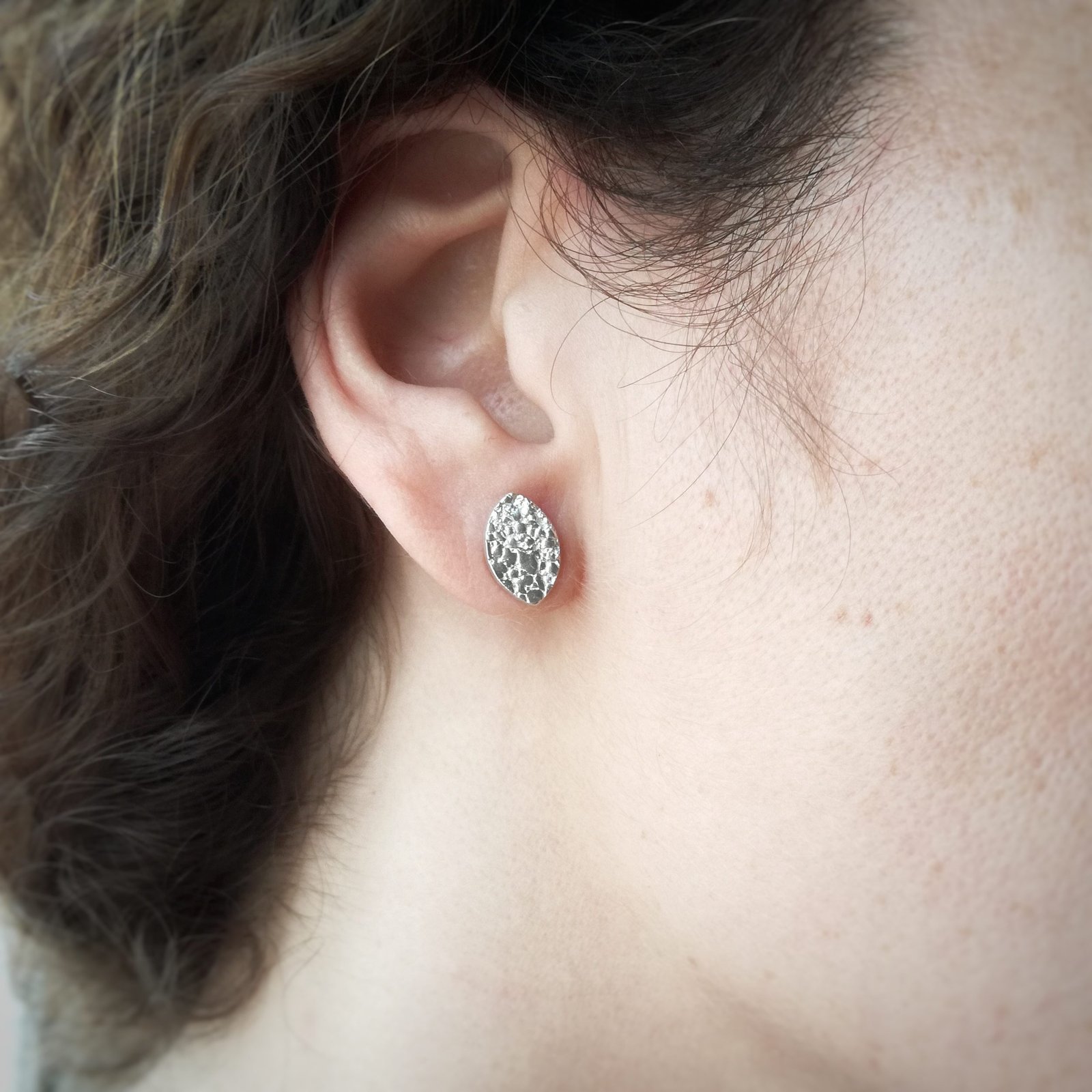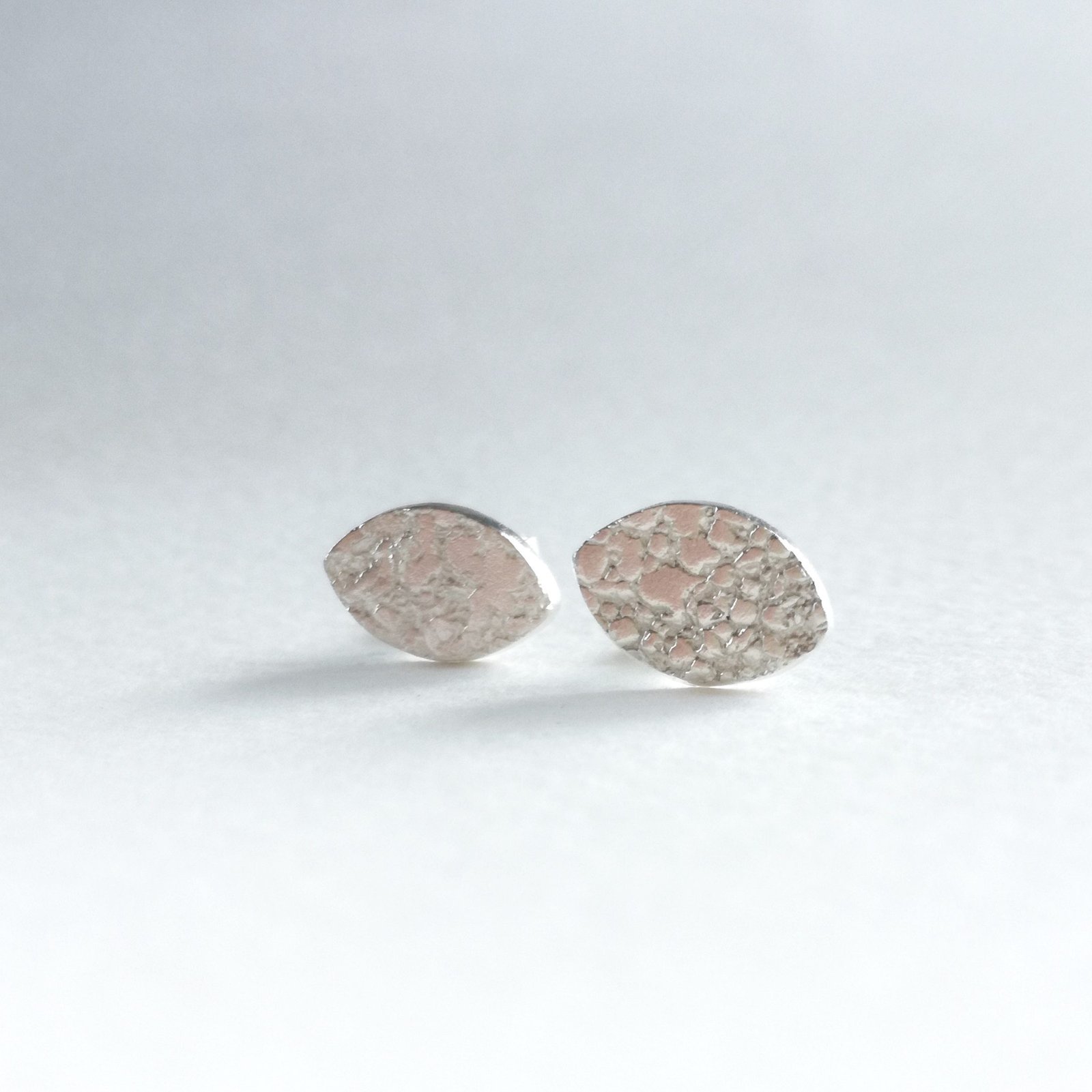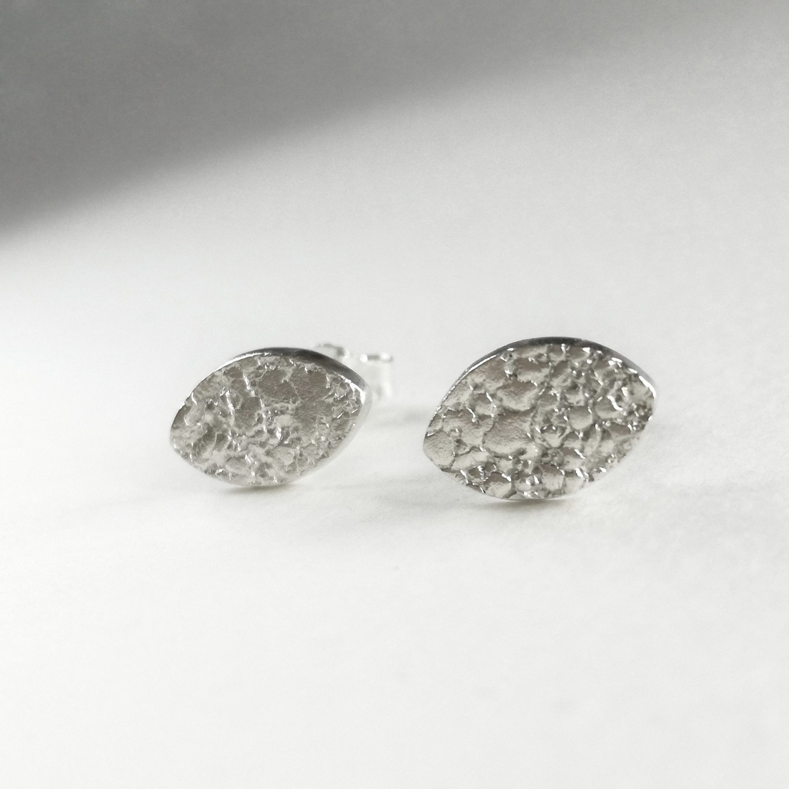 Elegantes pendientes de plata en forma de botón, con forma ovalada y una bella textura orgánica añadida.