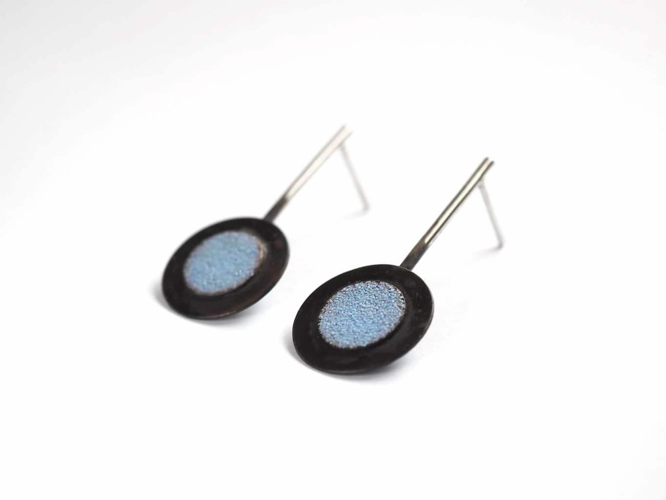 Pendientes de plata y cobre con diseño circular y esmaltados al fuego en color azul. Llevan una zona oxidada que resalta el color azul de la pieza y la plata.
